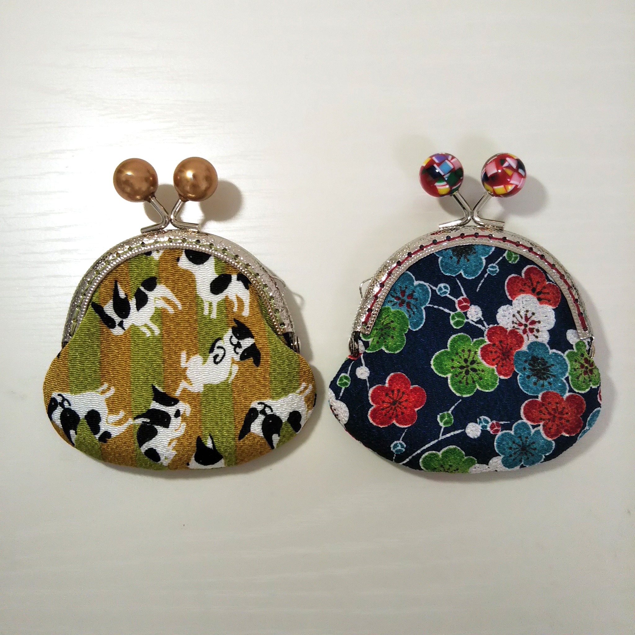 それと、カラフルでお洒落な梅柄のちりめん生地を使用して、同じくがま口小銭入れを製作しました!