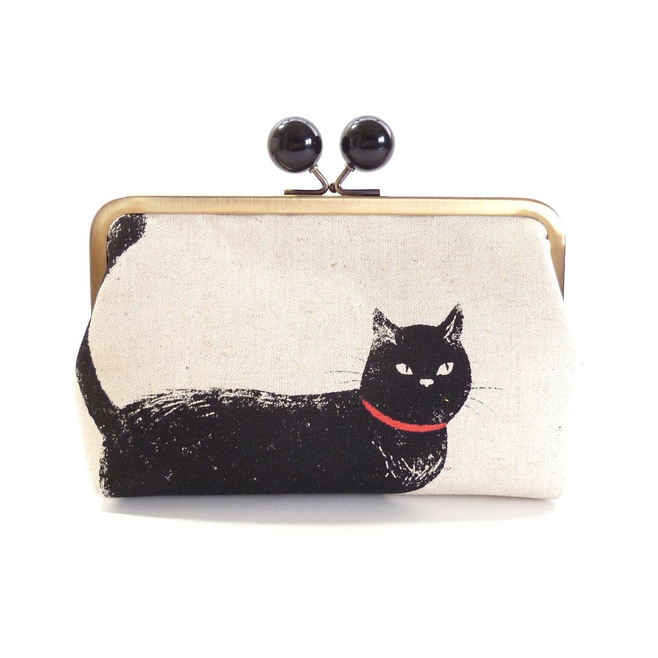 あめ玉のがま口ポーチ 黒猫柄 生成り 化粧ポーチ G989