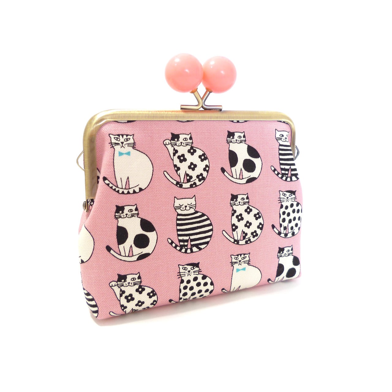 おすまししてお座りする猫たちの可愛らしい、がま口ポーチです。あめ玉の色も合わせています♪
