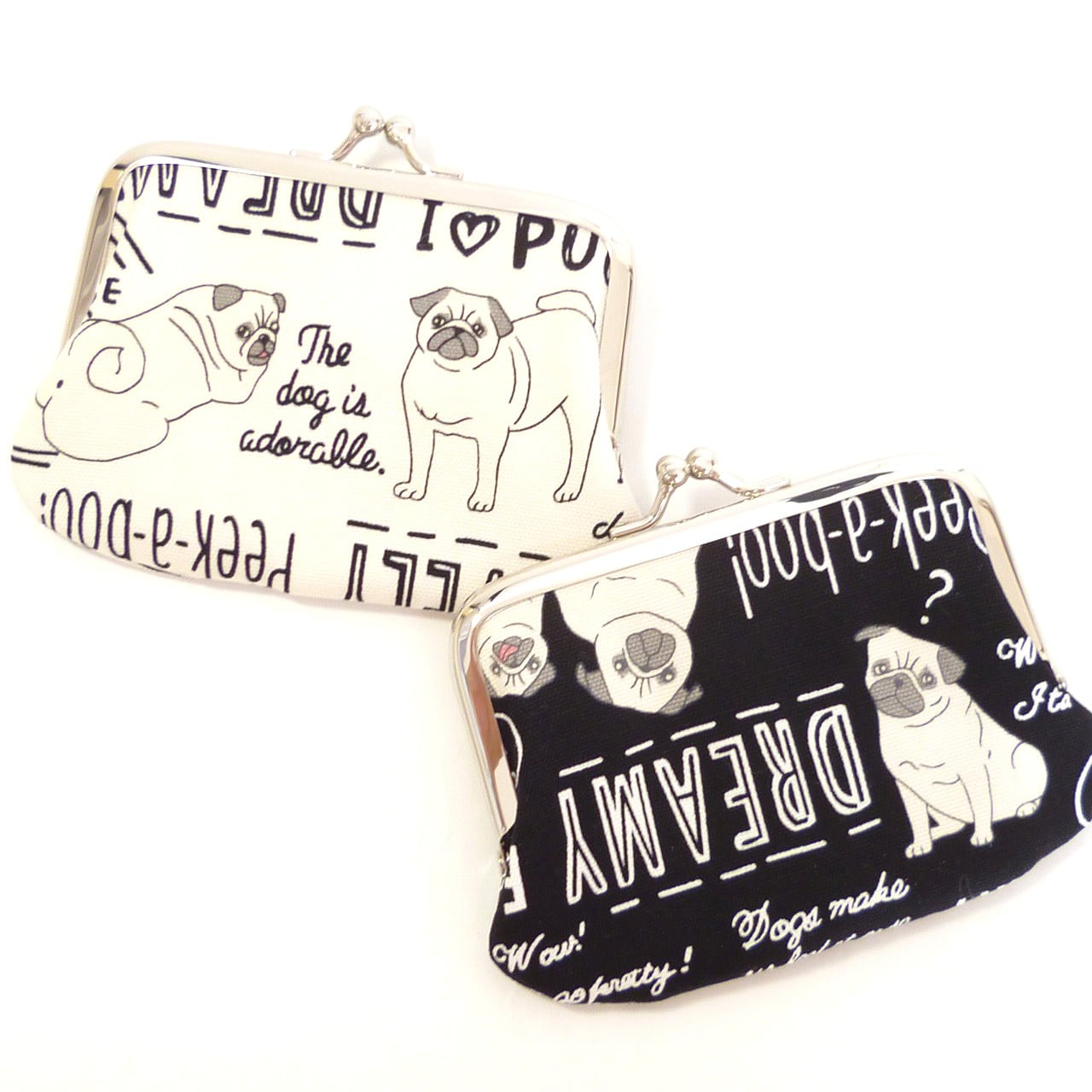 キュートでおちゃめなパグ柄のがま口です。いろいろな格好のパグが描かれています。