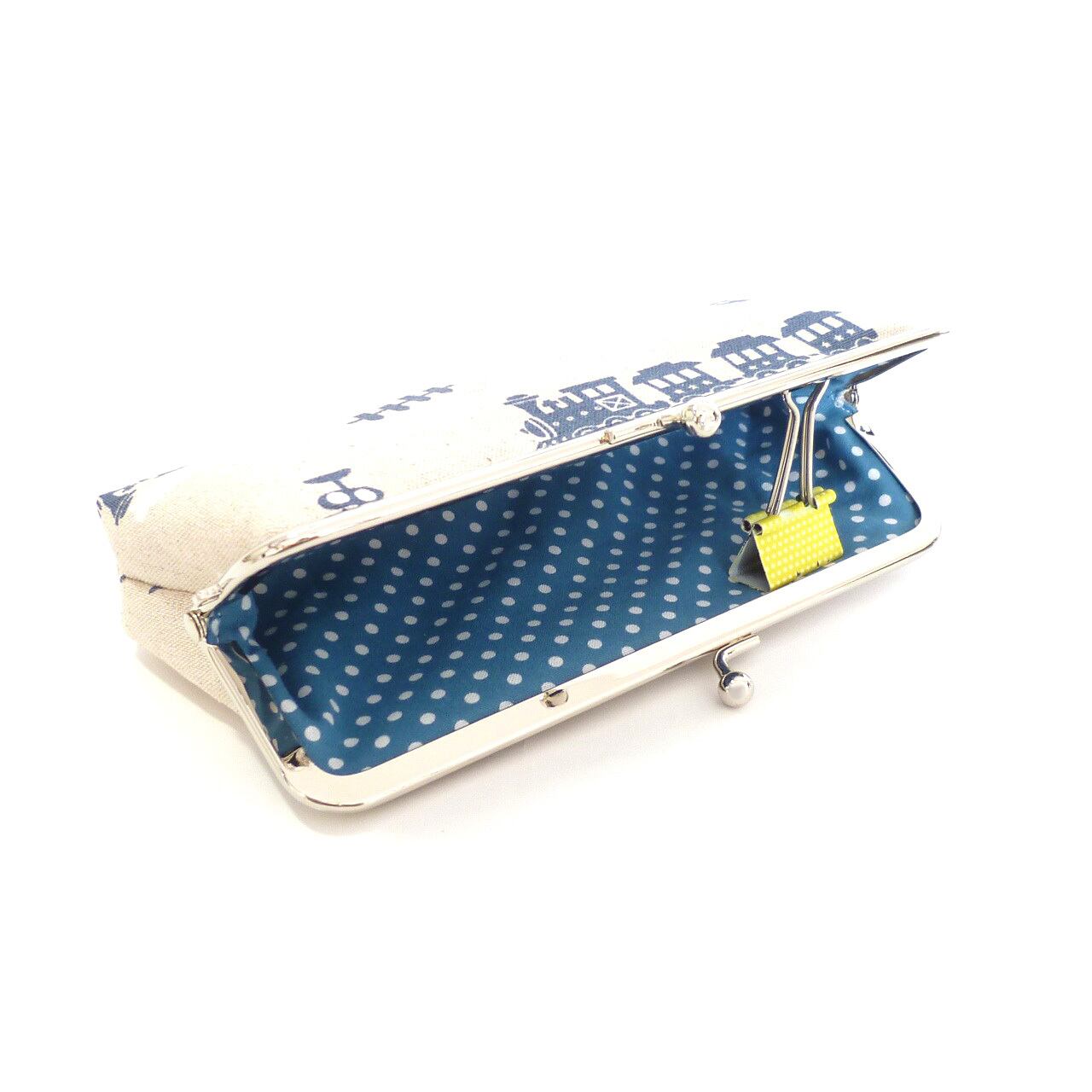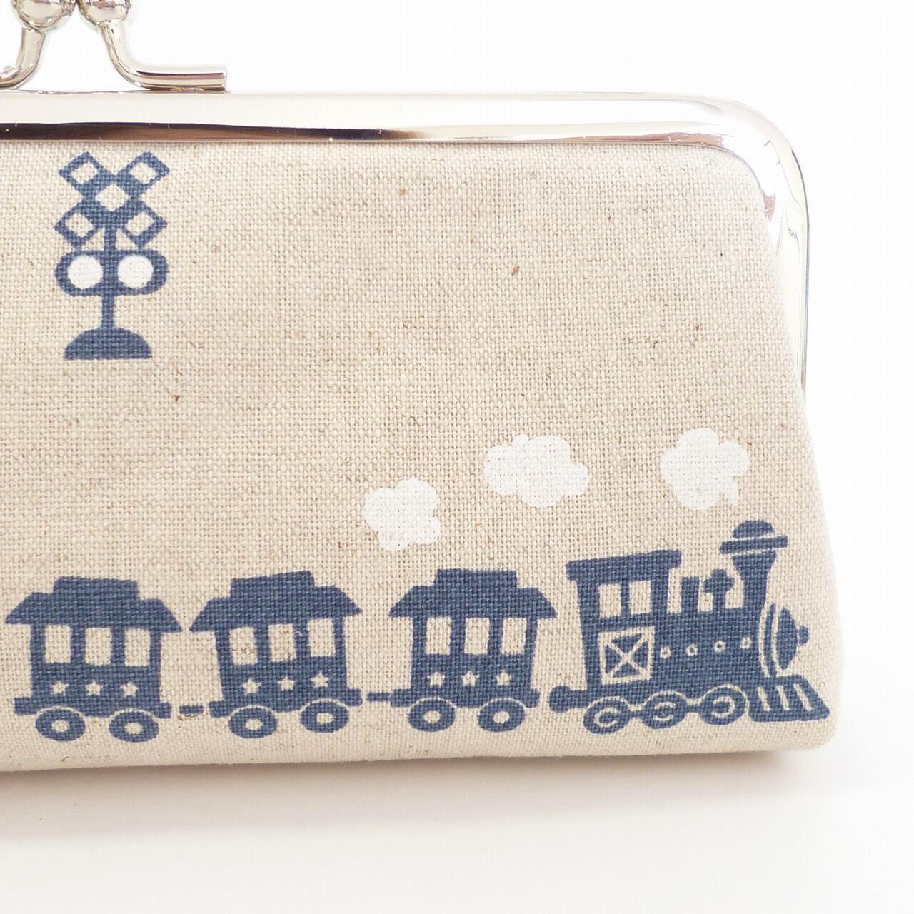 蒸気を上げて走る汽車のがま口ペンケースです。メルヘンな雰囲気でかわいい柄です。