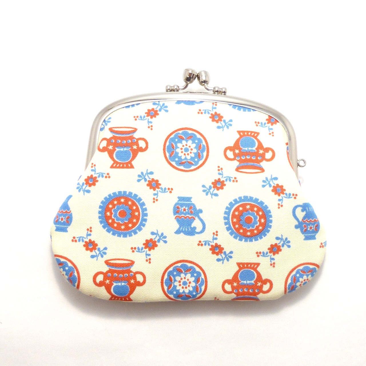 壺やお皿など陶器柄が美しい雰囲気のがま口親子がま口です。外ポケットが付いていて、カードや小物をちょっと入れておくのに便利です。マグネットボタンでとめることができます。