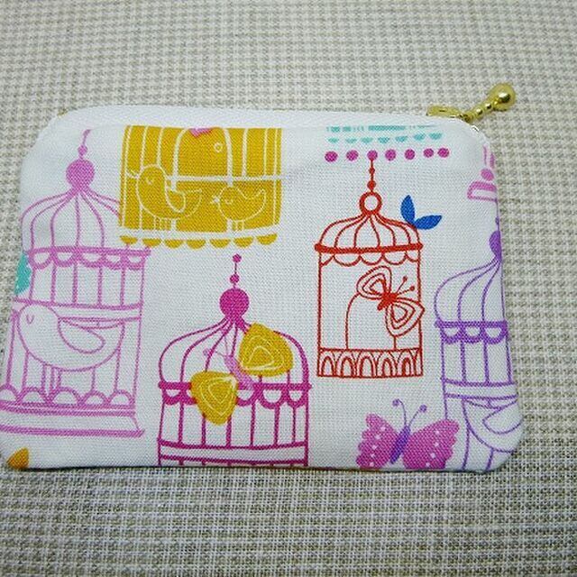 鳥かごに入った小鳥さんたちと、ひらひら舞うちょうちょの柄が可愛らしいコインケースです。