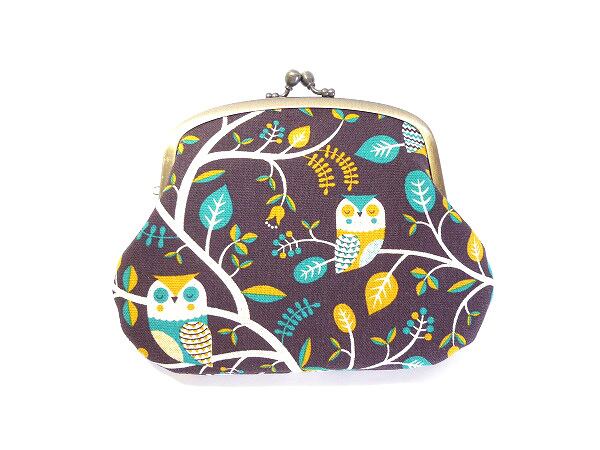 森の中のふくろうさんの親子がま口です。木に止まってこちらを見ているカワイイ柄です。