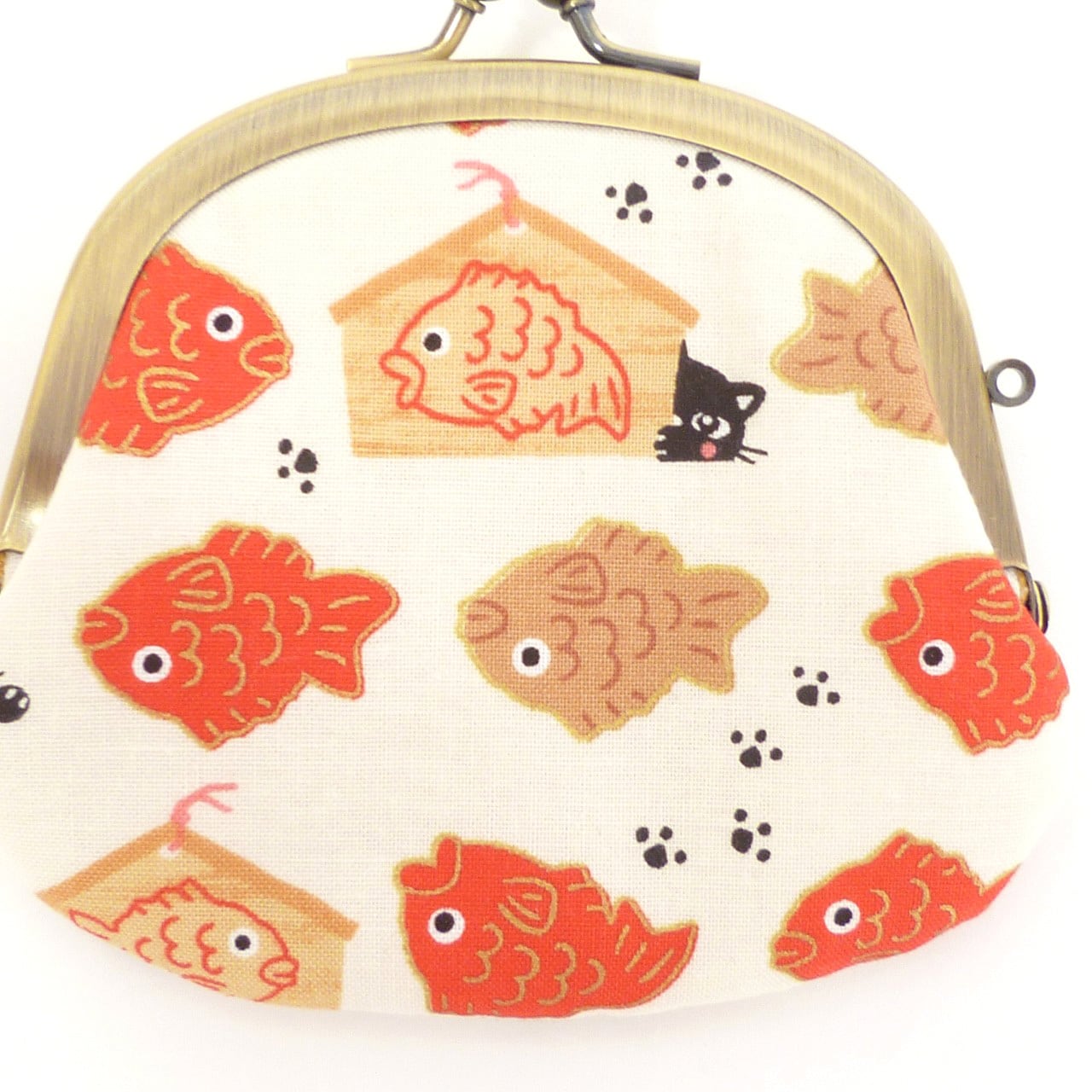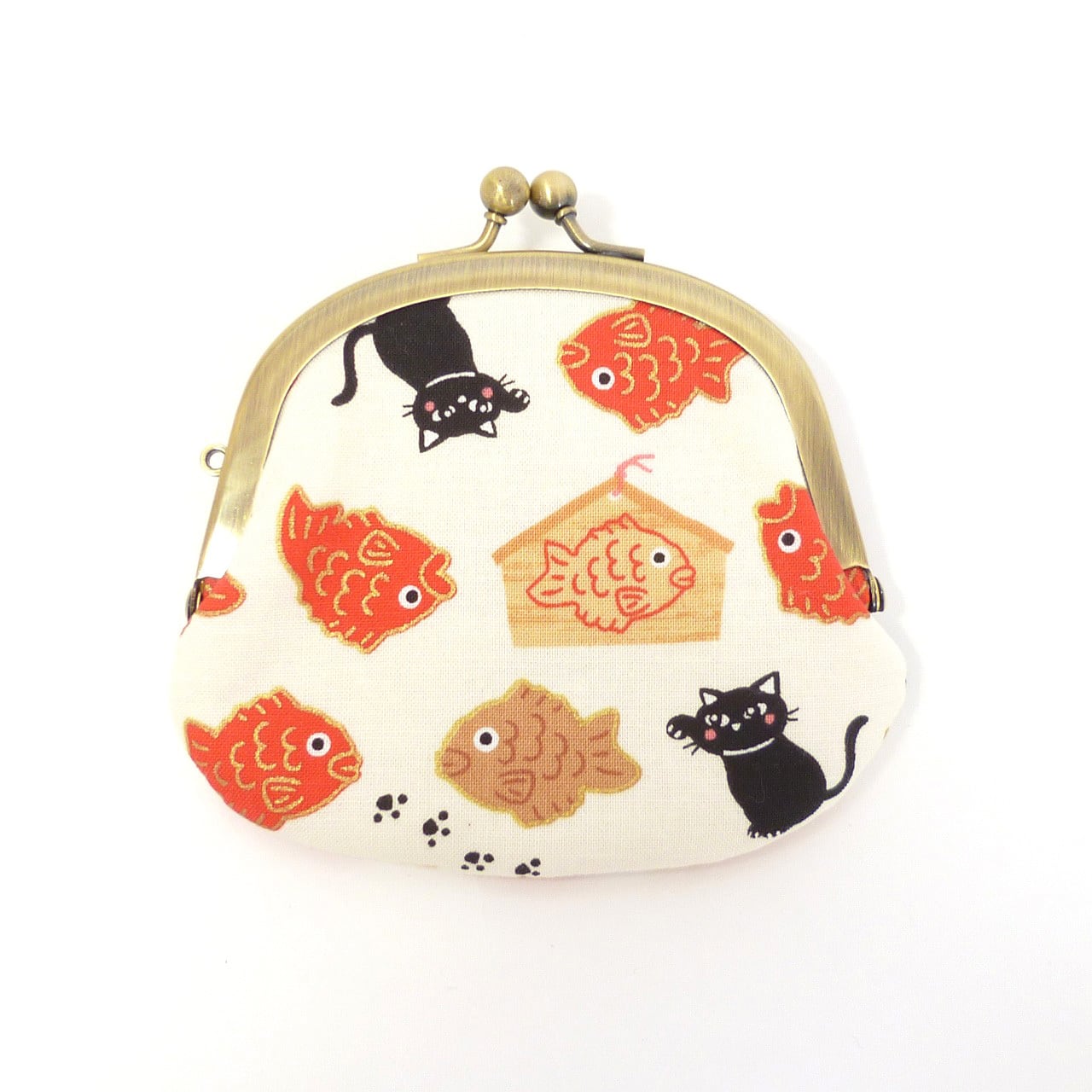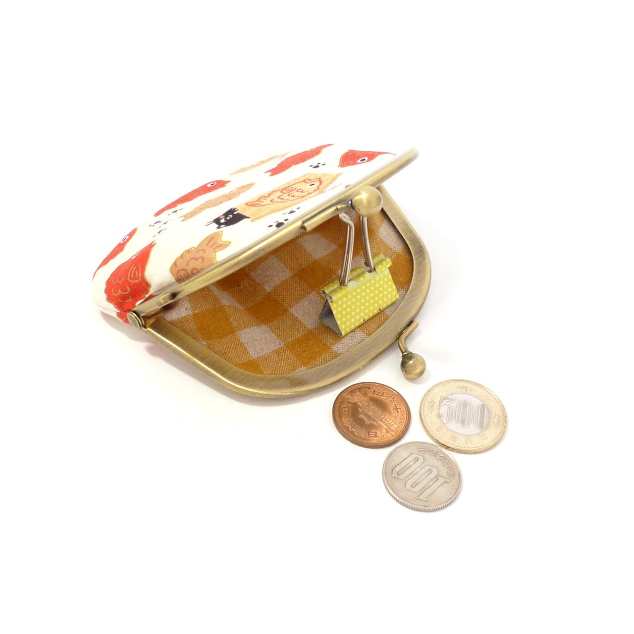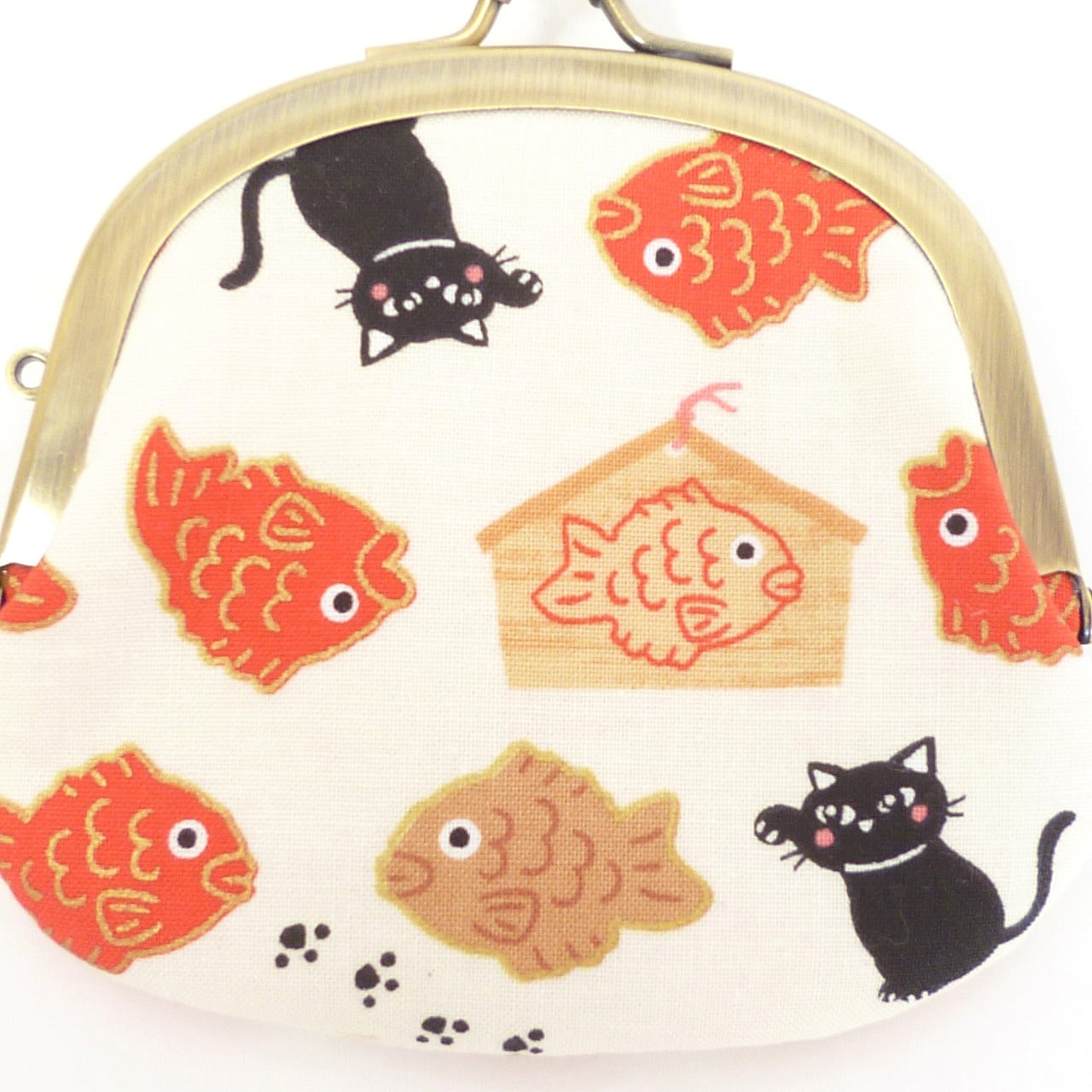 9/13追加★ がま口小銭入れ 鯛とたい焼きと猫柄 白 和柄 コインケース G605 3.3寸 newitem