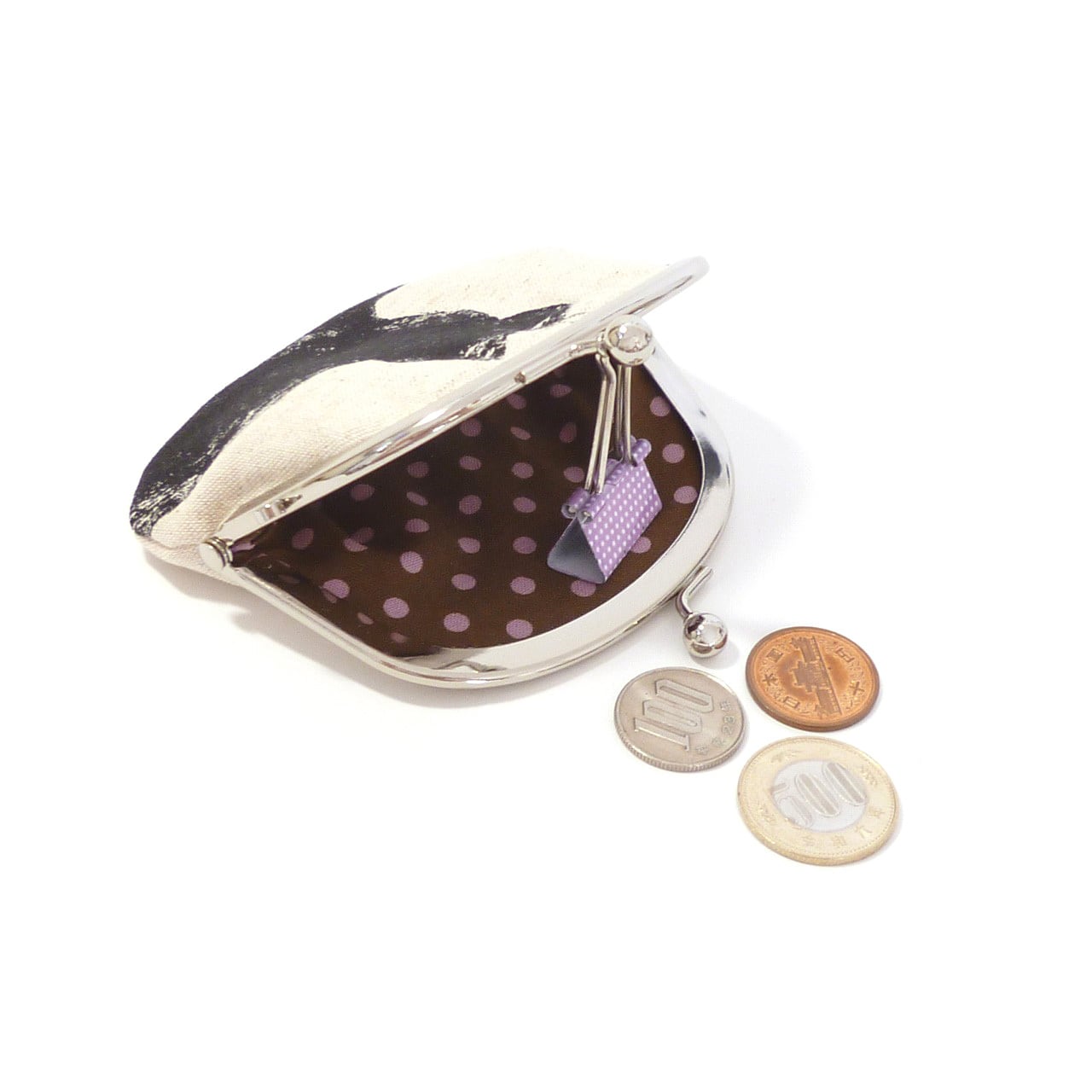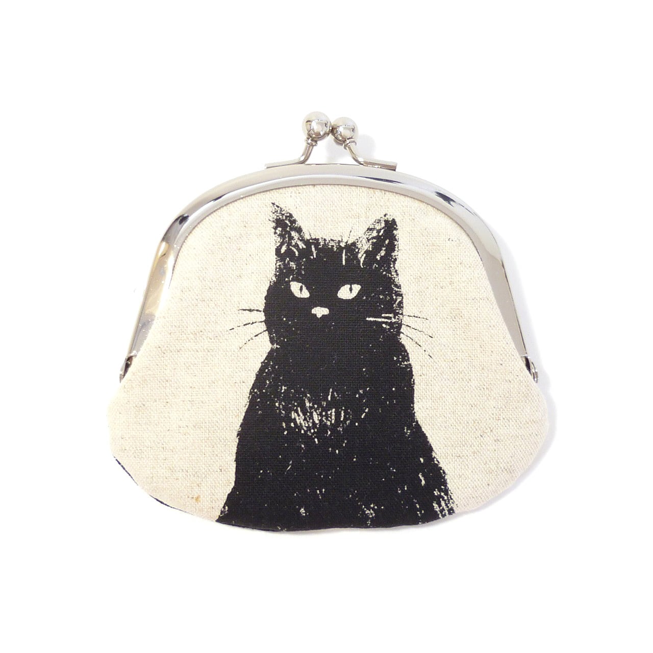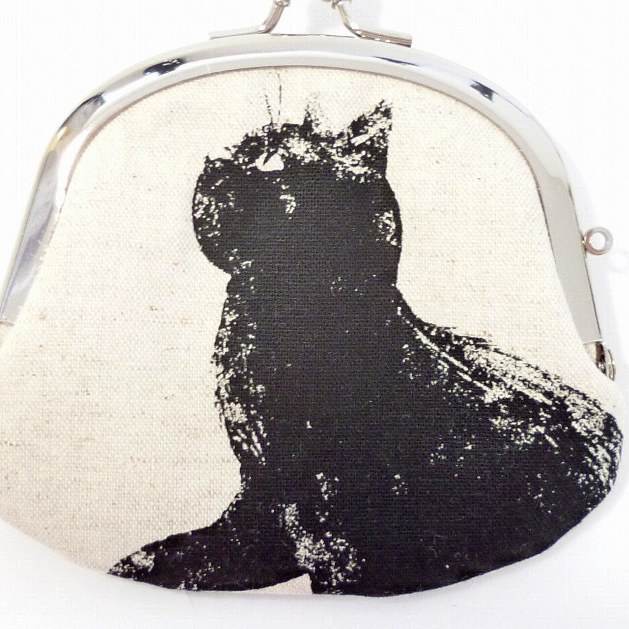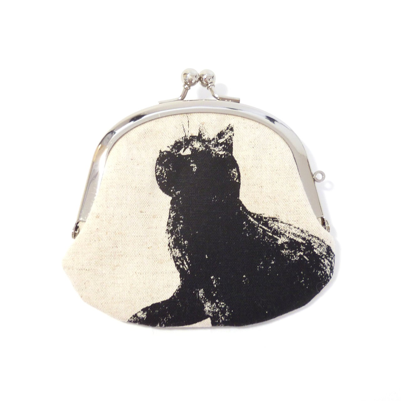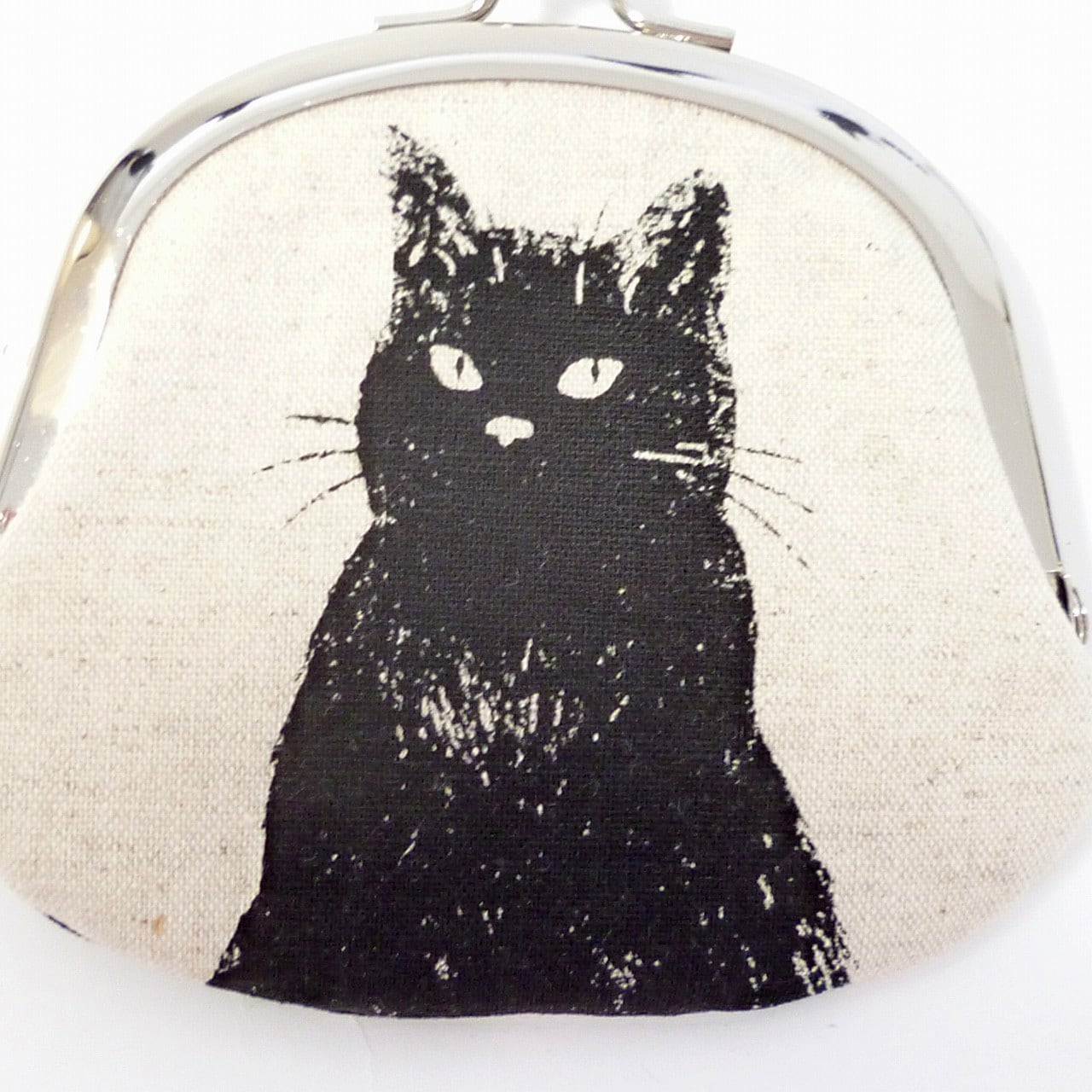 がま口小銭入れ 黒猫柄 生成り ネコ コインケース G573 3.3寸
