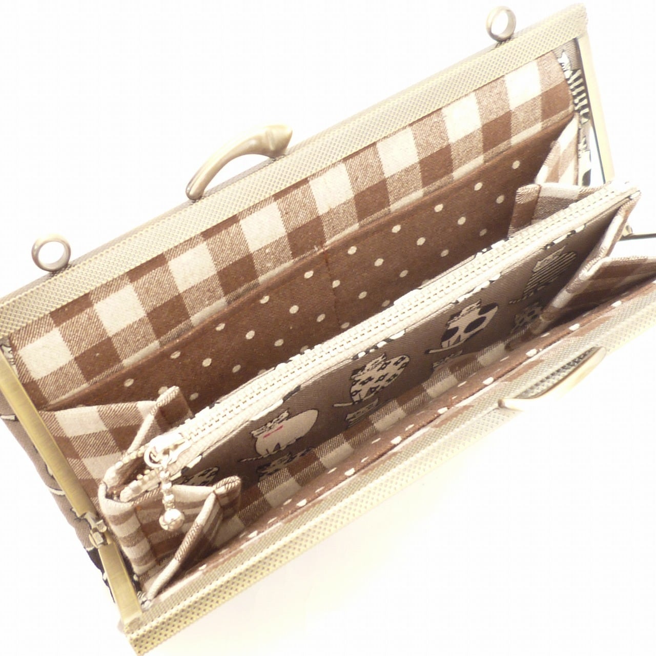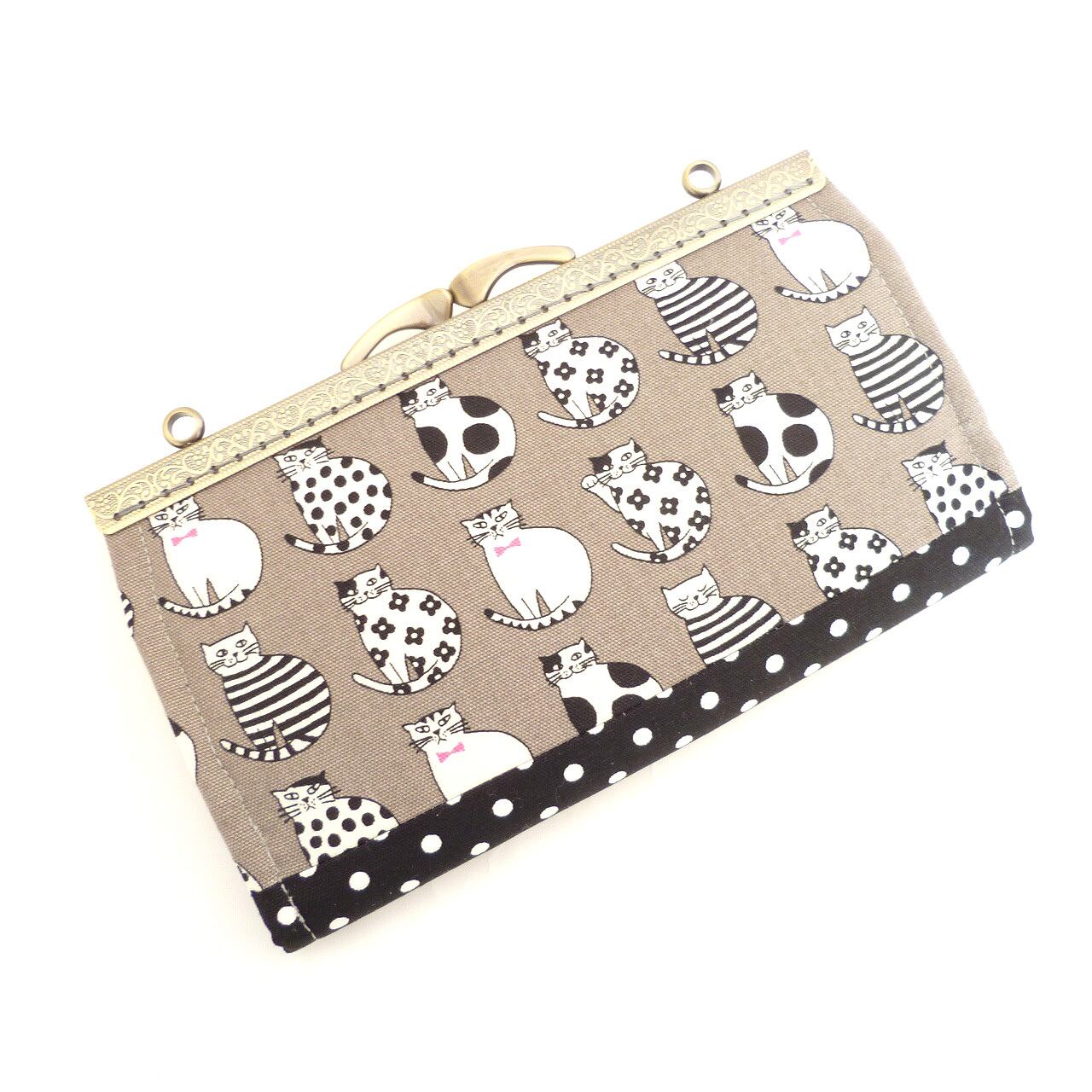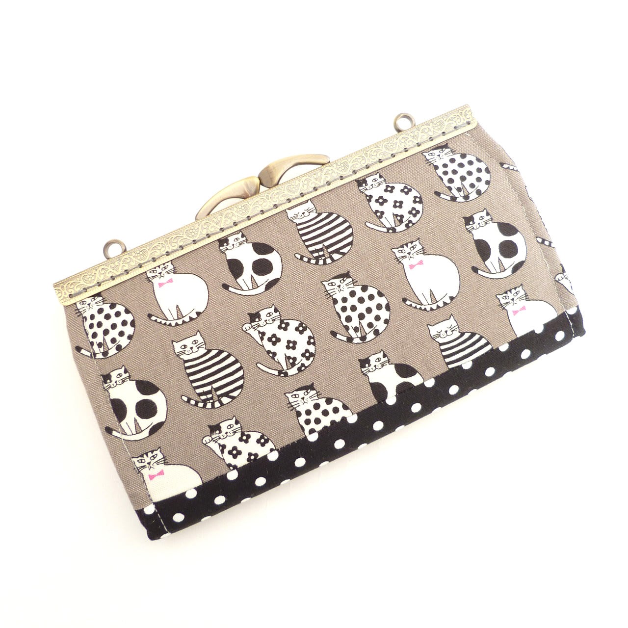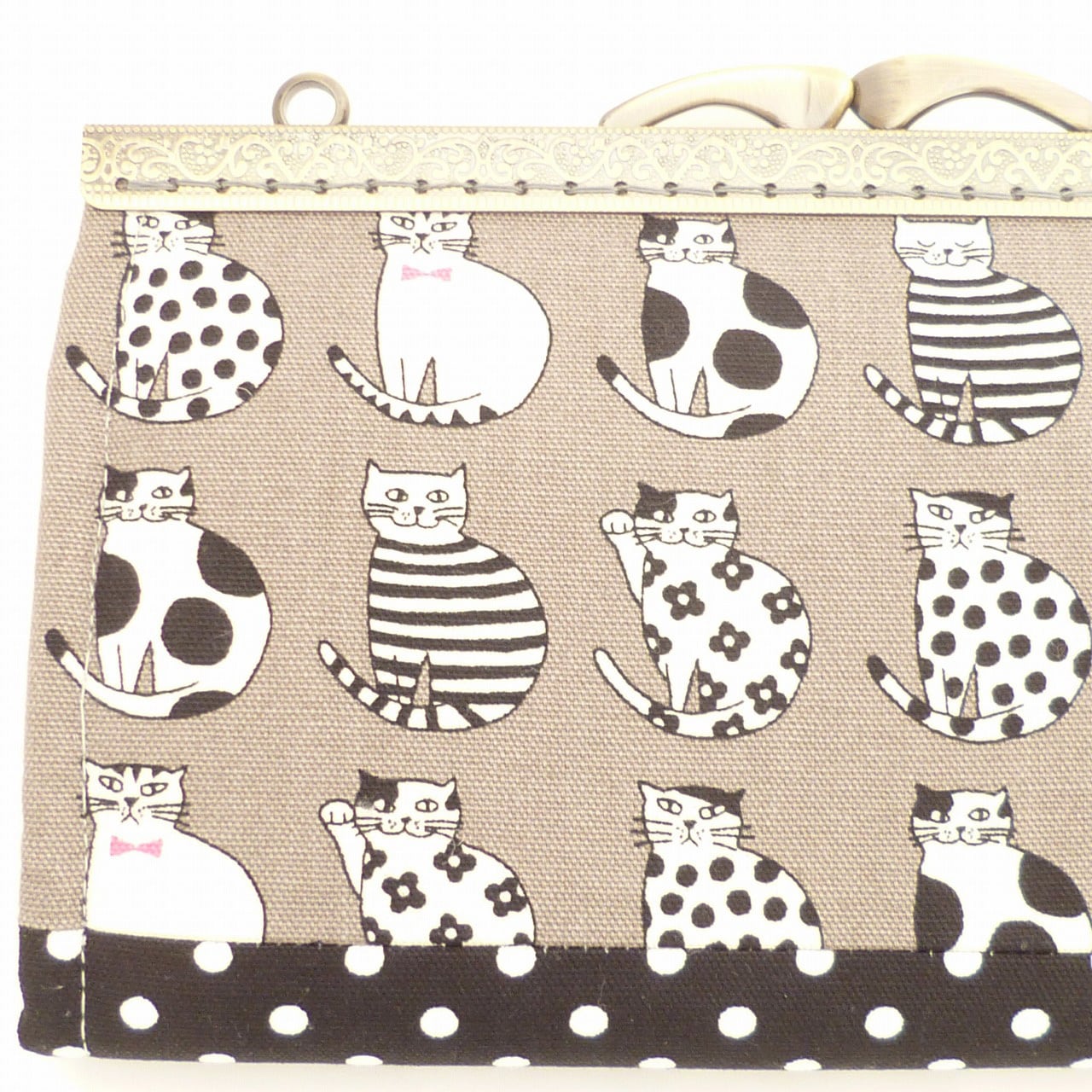 おすましして座る猫たちの可愛い柄のがま口長財布です。中には手招きしている猫さんもいます♪