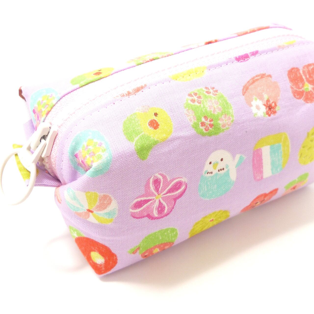 キャラメルポーチ (小) インコと和菓子 紫 小鳥 化粧ポーチ 小さめ C011
