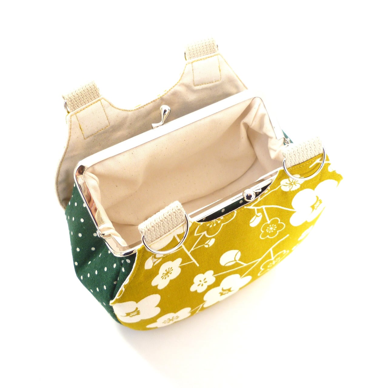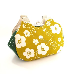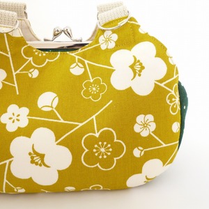 あおりがま口タイプのミニバッグです。両面には可愛い雰囲気の椿柄、横・底面には緑のドット柄を使用しています。