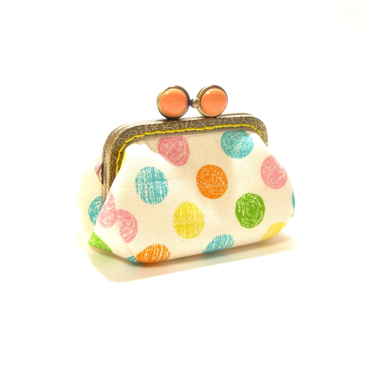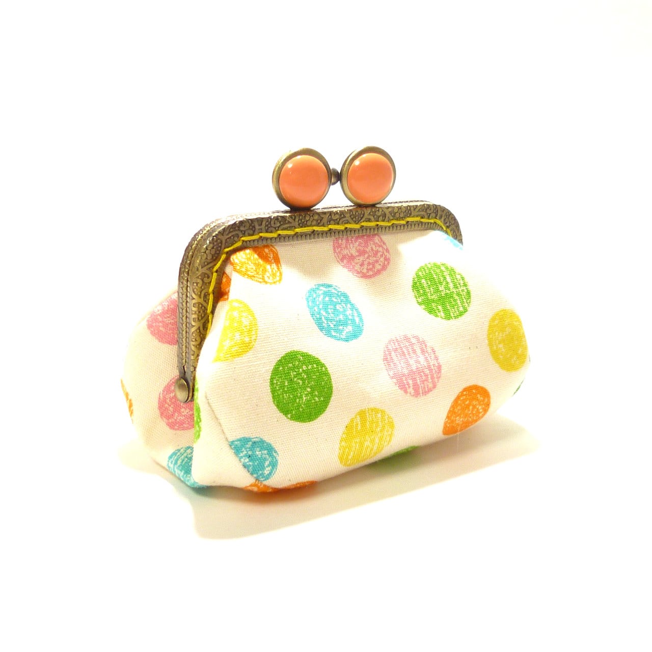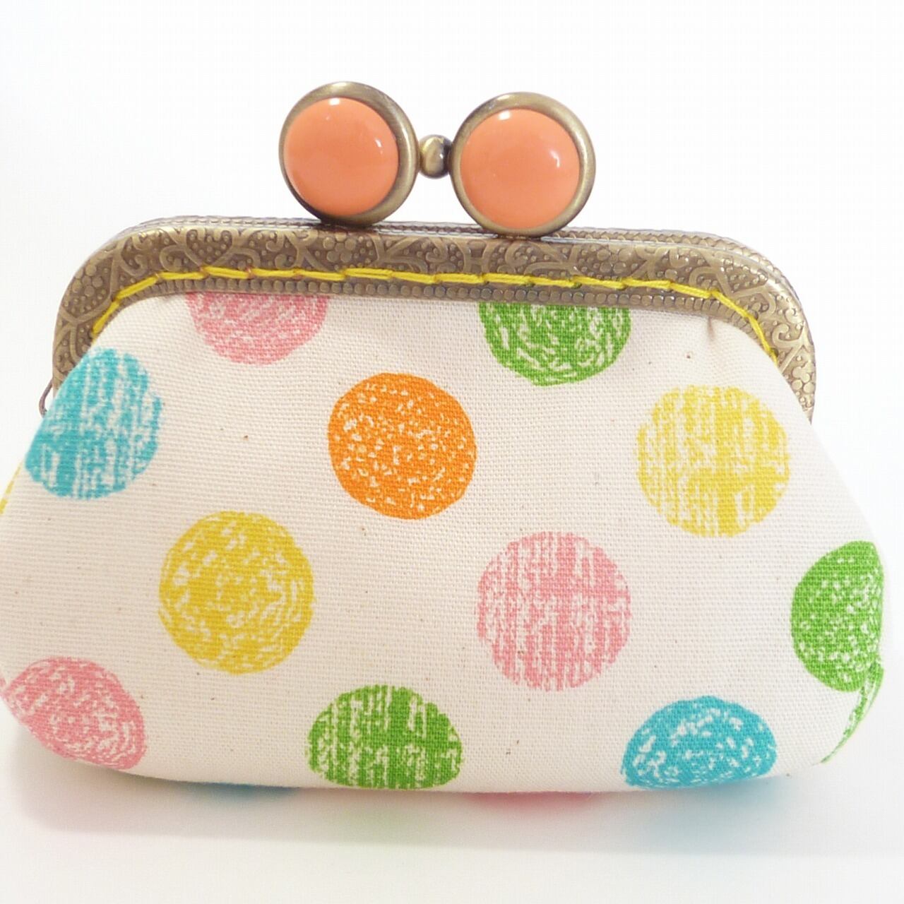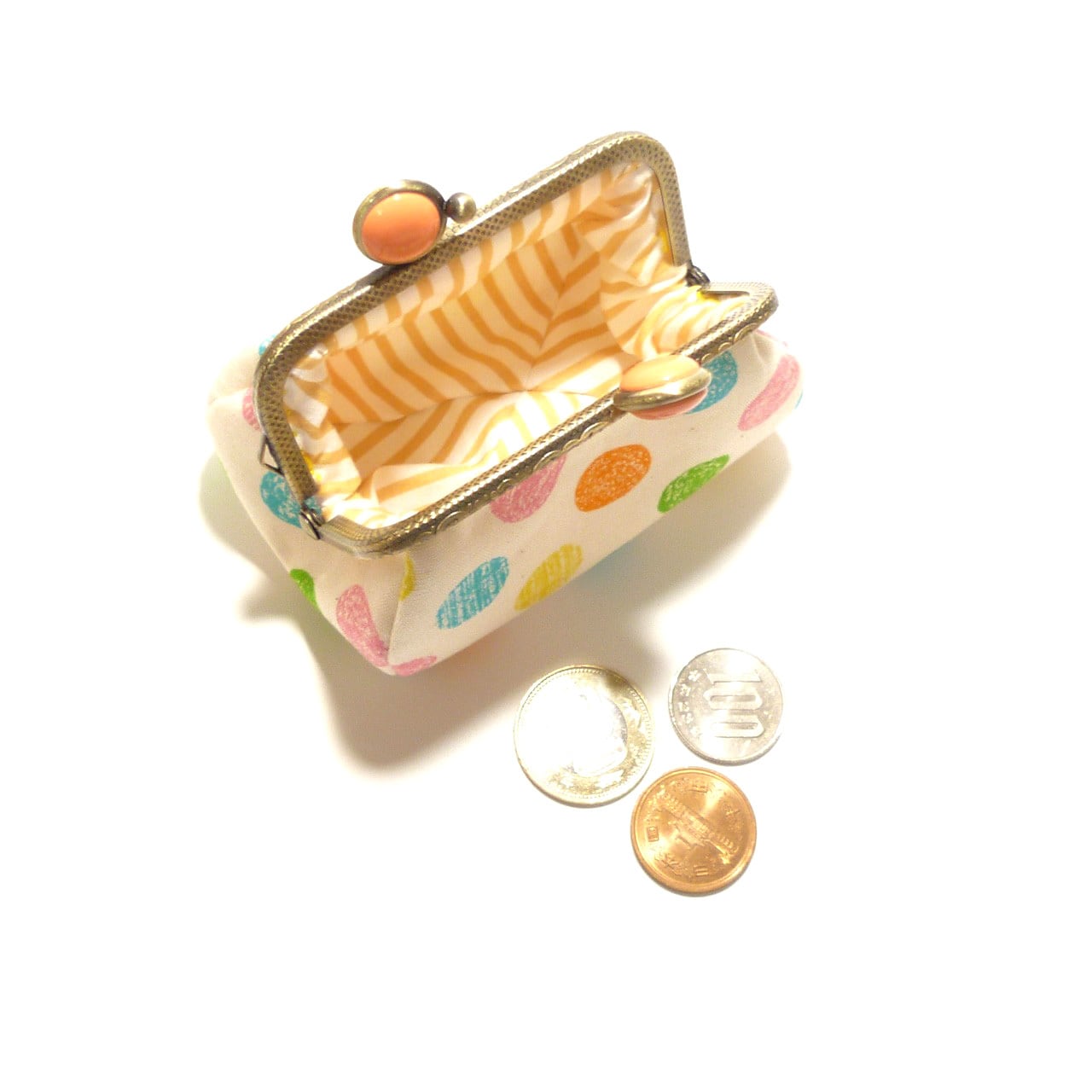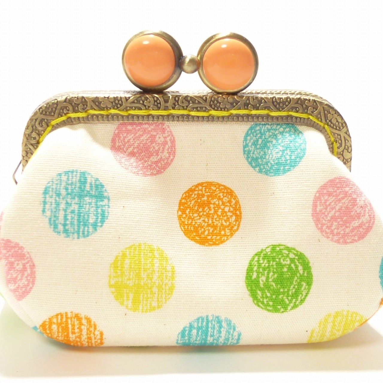 パステルカラーのドットがかわいいがま口です。オレンジ系で口金も合わせています。