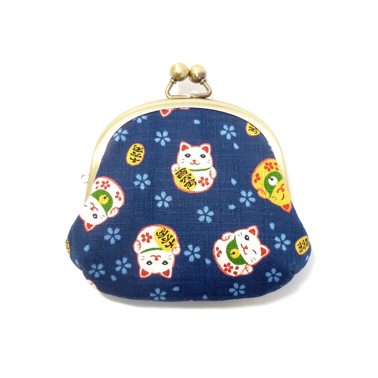 招き猫柄のかわいいがま口です。表情豊かな猫たちで幸せな気持ちになる柄です♪