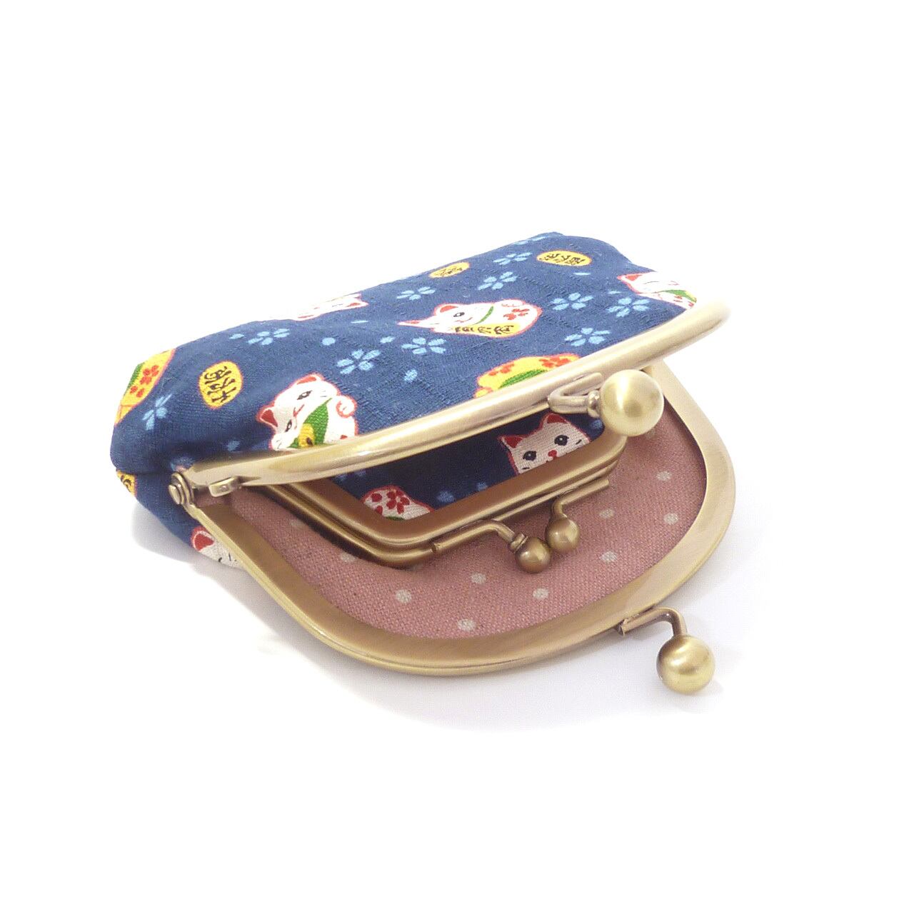 小さいサイズ 親子がま口 財布 招き猫柄 紺 ネコ G163
