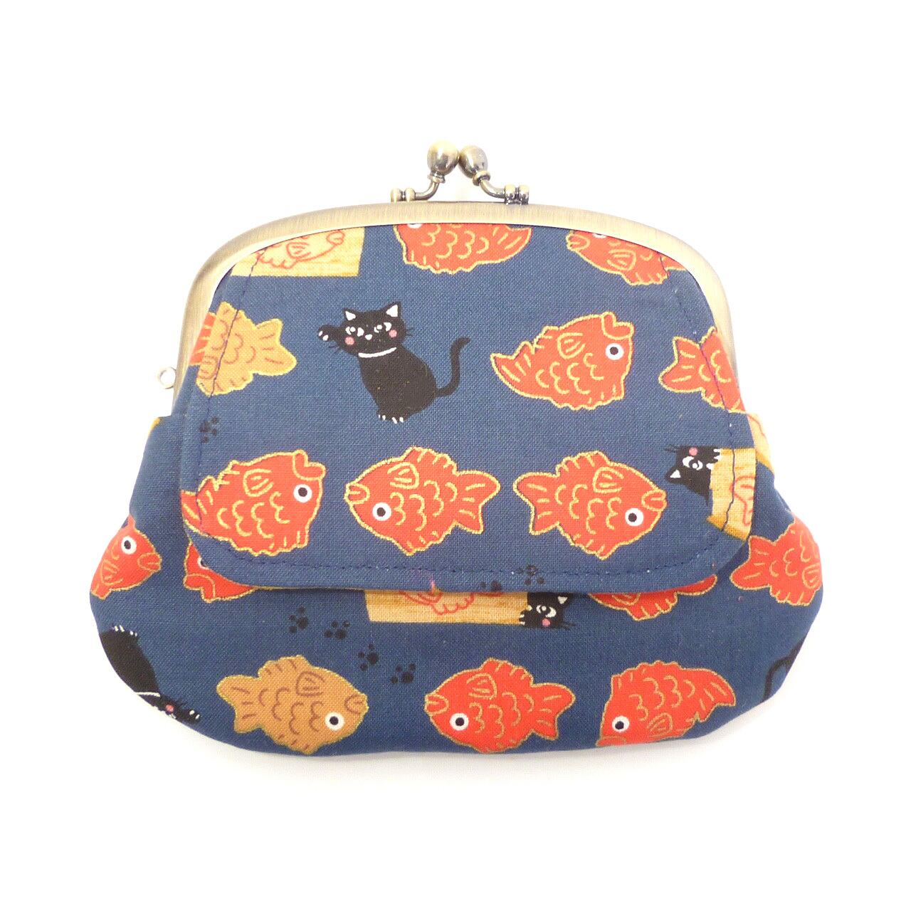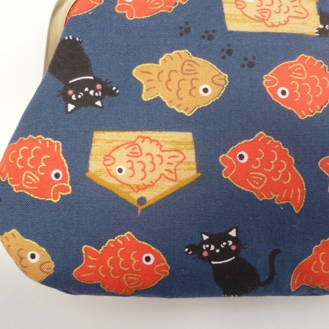 外ポケット付き 親子がま口 財布 鯛とたい焼きと猫柄 紺 ネコ G418