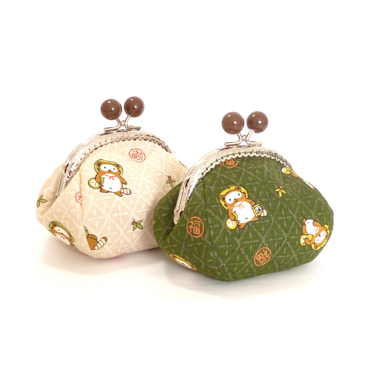 置物風のたぬきさんがかわいいがま口です。寝ているたぬきさんもいます!