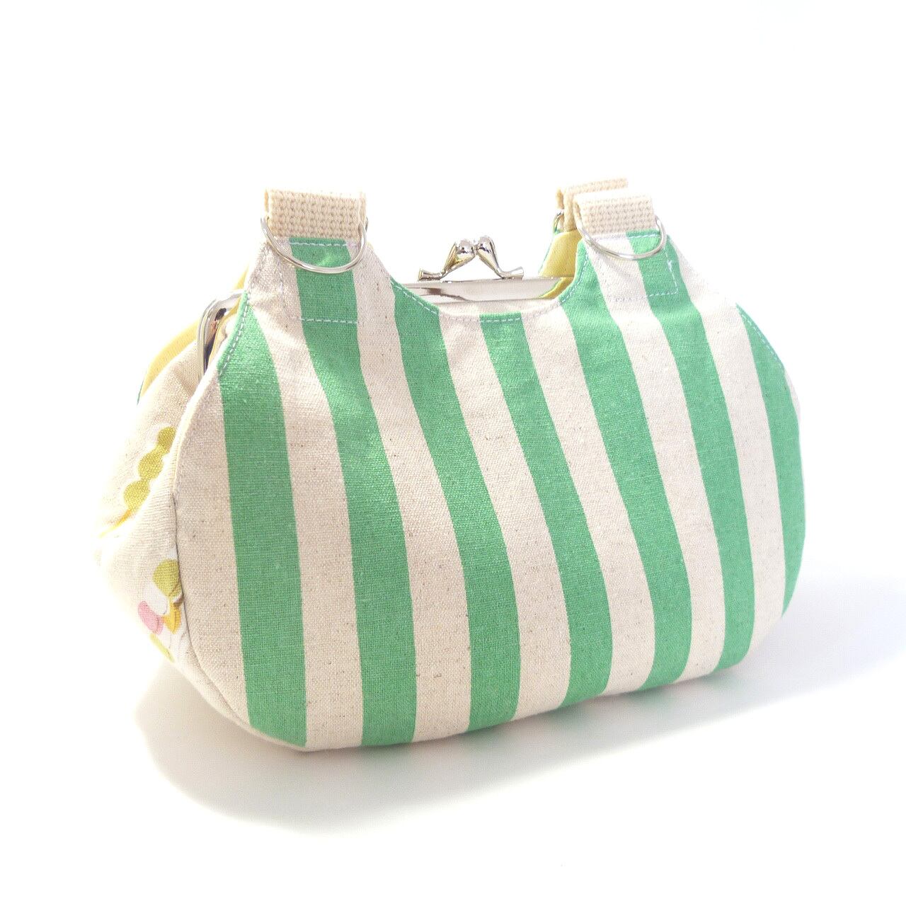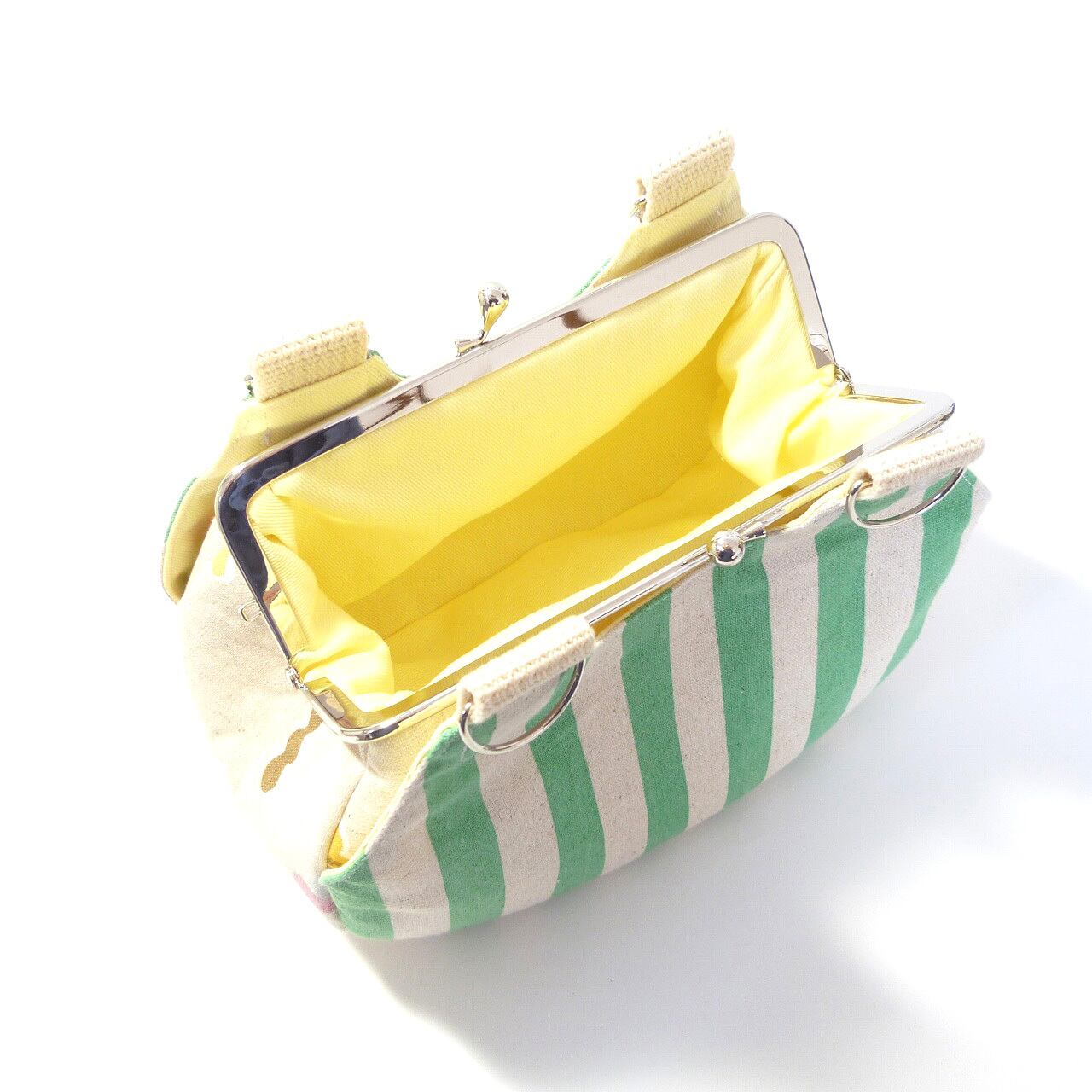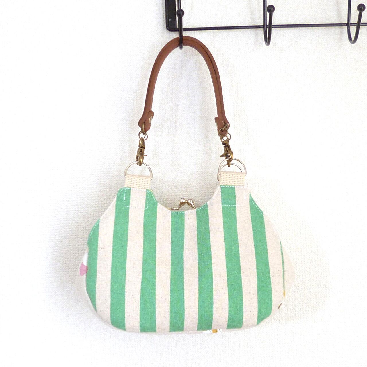 あおりがま口タイプのミニバッグです。両面は明るいグリーンのストライプ柄です。