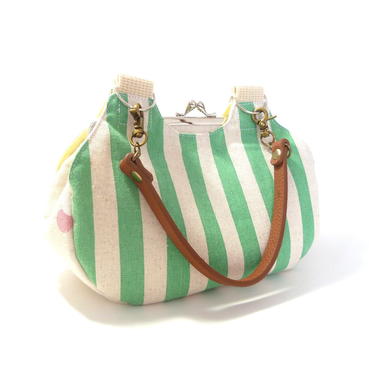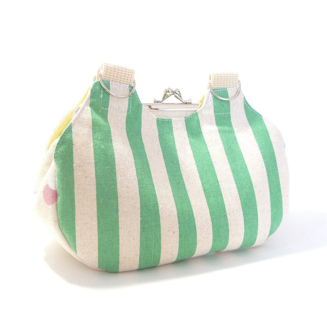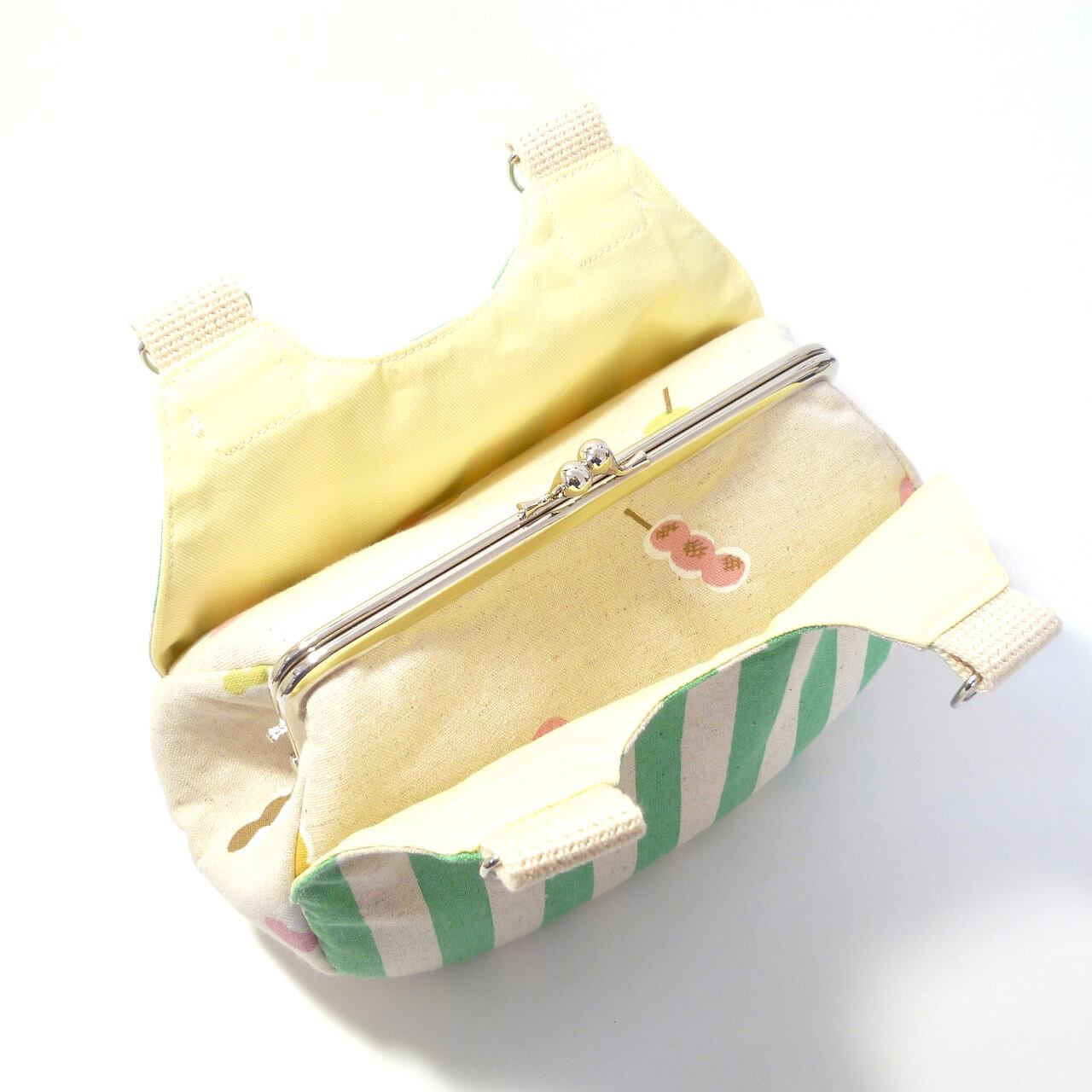 あおりがま口タイプのミニバッグです。両面は明るいグリーンのストライプ柄です。