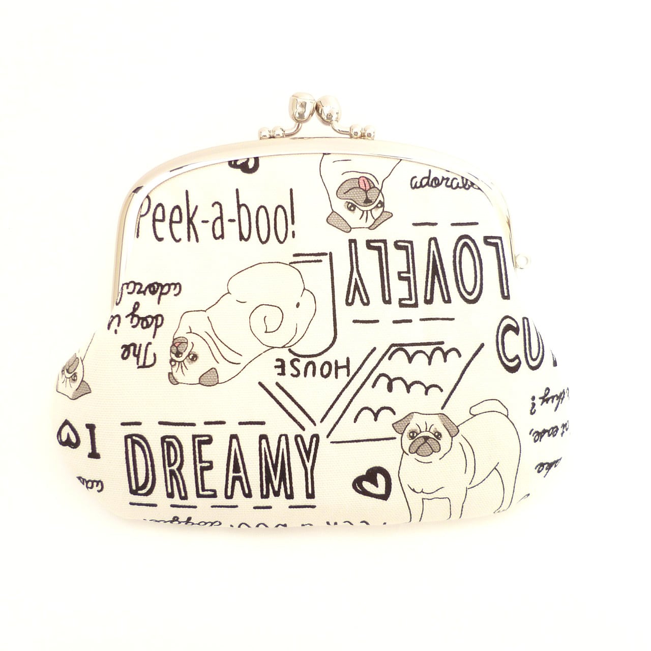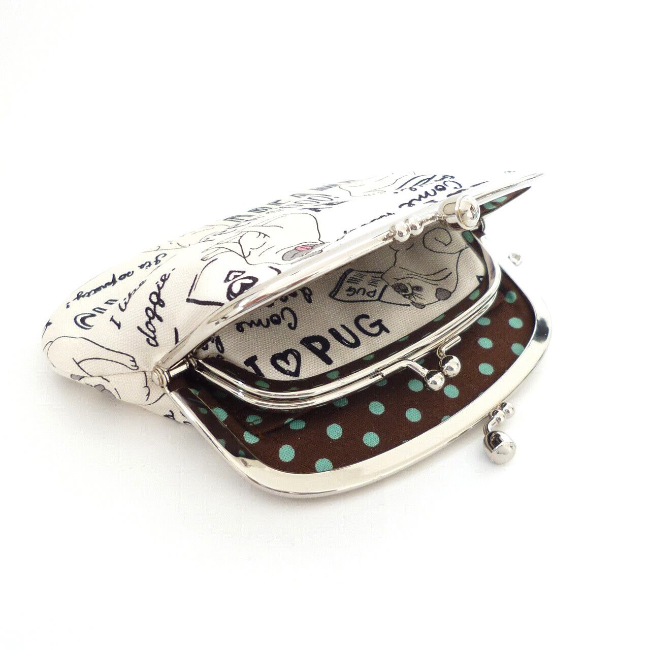 キュートでおちゃめなパグ柄の親子がま口です。いろいろな格好のパグが描かれています。