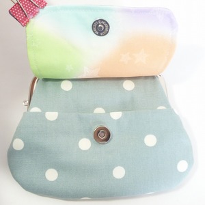 水色のドット柄がかわいいがま口財布です。内側はパステルカラーの星柄の生地を使用しています。外も中も可愛いデザインです♪